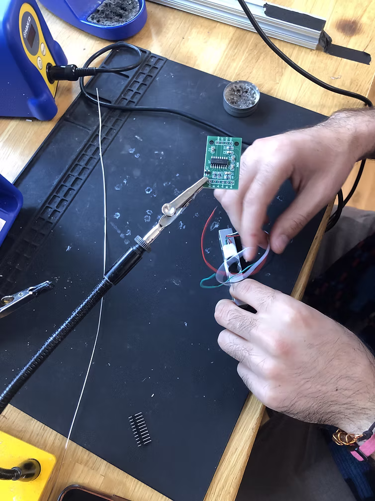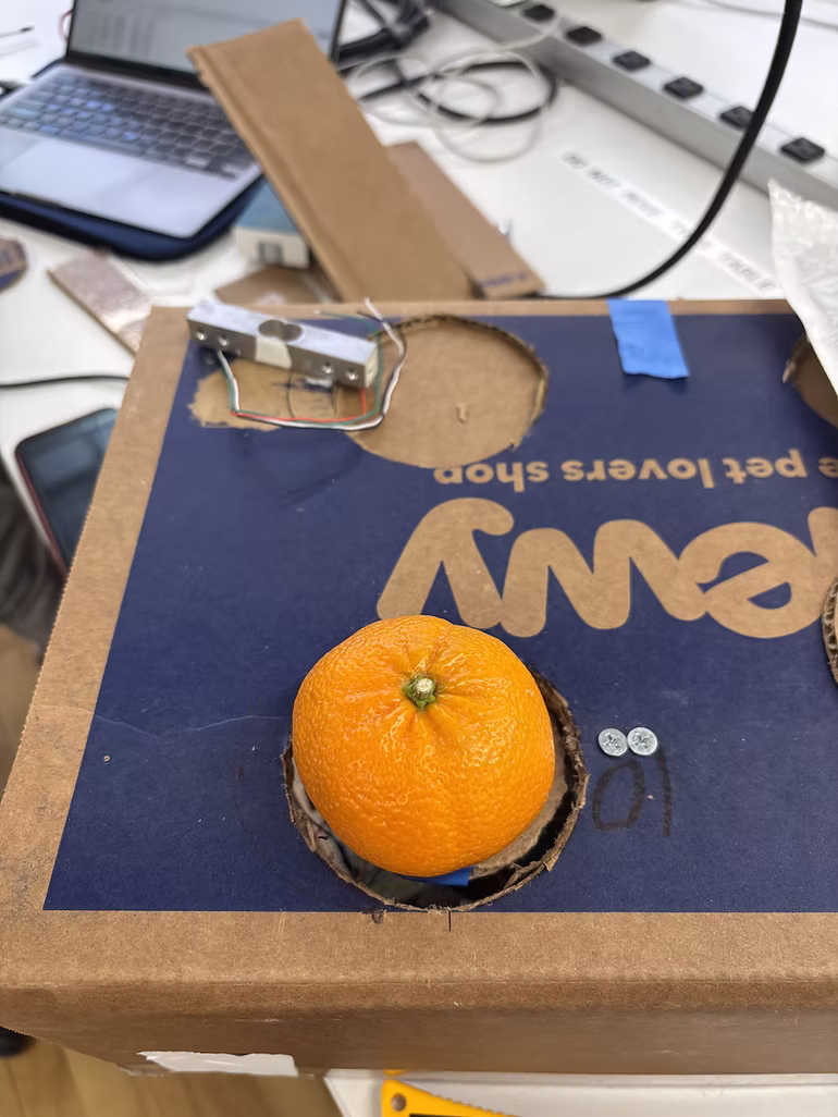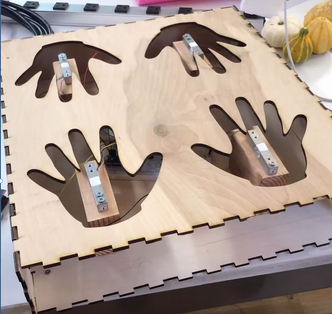We moved on with the last idea. we decided to build the device like a small stage of a halloween festival not sure if we should decorate it like a halloween lawn or a pile of hay with haloween items decorating it. We agreed to move on with the technical side and start testing the pressure sensors. We soldered the load cells so we can connect it to the arduino, and later discovered that they work best when attached halfway to an object having half of the surface exposed and free to bend. After testing the sensors can read pressure value properly we went on to build the mockup for the stage so we can start testing the interaction of the instrument with different items.