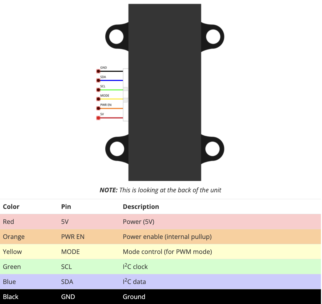 The sensor itself was easier to set up than expected. To observe general distance from the sensor, the Mode and PWR EN wires could be ignored. The rest of the system could be set up as a simple I2C connection communicating with an Arduiono through the SDA and SCL pins. In the system, the two I2C connections use a pull-up resistor to ensure adequate current flow. The sensor is powered by a minimum 680uf capacitor by 5V DC power.