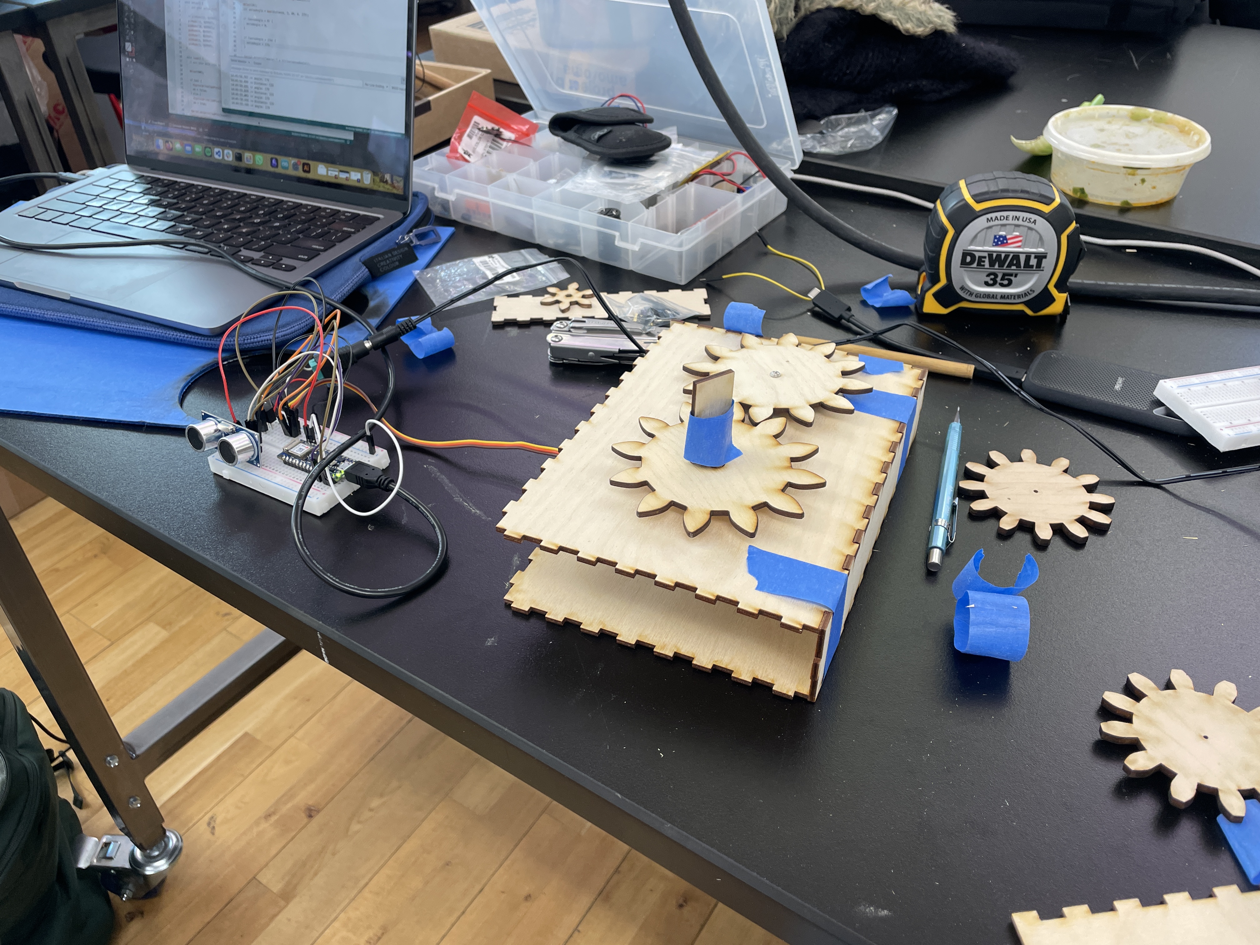 With the circuit made, I pivoted to creating a prototype mechanism to test how the servo could rotate a gear. Using scrap material by the laster cutters I found enough material to make a box and two gears. The box's height was fit to the servo so the gear could be as close to the ground as possible. Another gear was mounted to a dowel which was cut to the same height as the servo so both gears could be aligned. Since I used scrap wood, the plywood was slightly warped so the gear's teeth did not alsoway fit perfectly. Though I was surprised to see the system actually work.